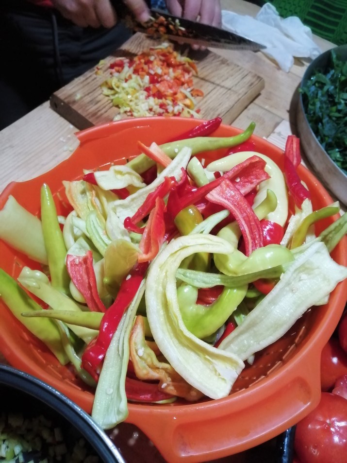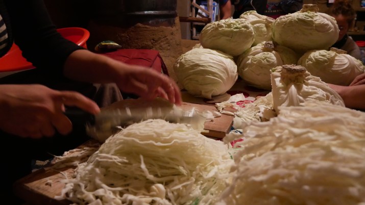 What we could not grow or find around, we bought from neighbors and local farmers. Thus, we spent some nice evenings taking care of the 300kg of cabbage we got, cleaning them, cutting them into thin slices, mixing them with salt, pepper and bay leaves, before smashing them a bit and to cover them with water. We will let them lacto-ferment for few weeks to obtain sour cabbage, a meal that is not only delicious but also full of vitamins and can be kept all winter.