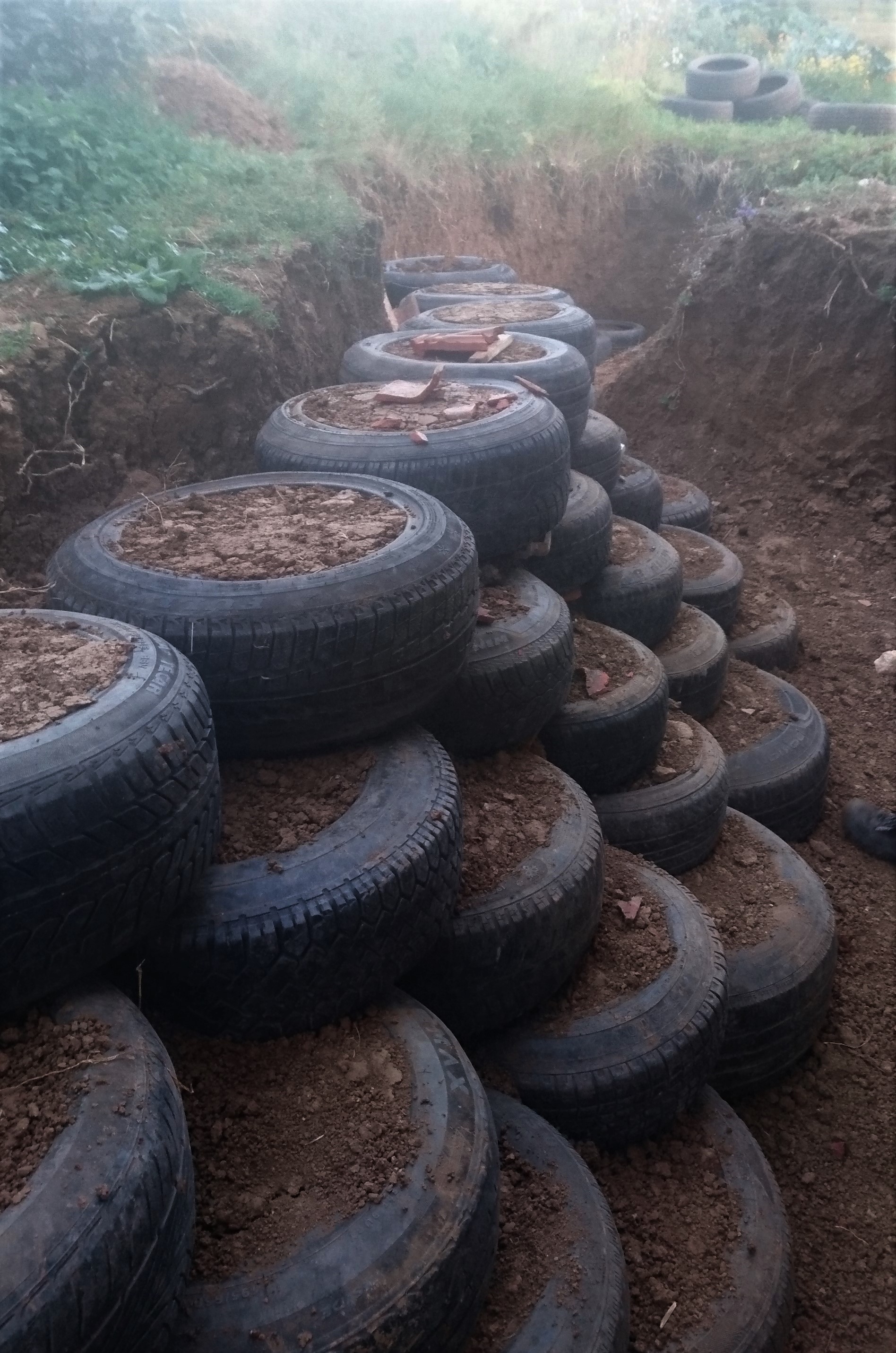 Autumn, with Her profusion, makes us think about the less prolific and tougher days Winter will bring in His frost coat. Preparing food for winter is then an important task to do during this period, but not the only one. Indeed, we worked a lot on the house and its surroundings too, to respond to the Autumn and Winter promises of a cold and humid weather. We worked on solutions to the muddy problems we are facing each time there is rain or snow falling or melting on the property; we started by making a tire wall around the Red House to prevent landslides. The principle is to pile and stagger tires filled with really well compacted soil, so that it becomes a rammed earth brick encased in rubber. This technique is used to build Earthship, self-sufficient houses made out of both natural and upcycled materials, and it is a way to give a purpose to the numerous broken tires abandoned in the forest. After many weeks of work, hundreds of tires carefully chosen, positioned and filled, a few puzzling designing challenges, two mass handles and one spade broken, we finally put, with a tremendous joy, the last tire. After removing the excess soil remaining, flattening and putting pebbles, we now have a nice, mud-free path and space behind the Red House.