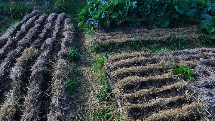 Therefore, to reach more food autonomy, and bring more life and happiness in our plates/stomachs, we expanded the garden by building new beds in the Forest Garden: step 1 – define and design where to put the new beds step 2 – aerate the soil step 3 – put wet cardboard on it (to prevent grass to grow) step 4 – add cow manure (for yummy nitrogen elements) step 5 – mulch with straw (for plant-building carbon elements and to protect the soil from drying, freezing, or being invaded by grass)