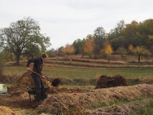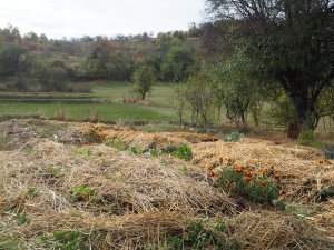 The garden has to be prepared for winter ; like us, it needs a good blanket and food. First of all to prevent erosion and to give it nutriments that it will need for the next spring ! The soil will slowly take the good food from the layers of mulch that we put on the bed. We mulched by altering cow manure and straw, like 5 or 6 layers, as a lasagna ! The garden is ready now, we put a bit of water to give humidity on the mulch that is important if we want that the decomposition to work well. The winter hibernation can start …