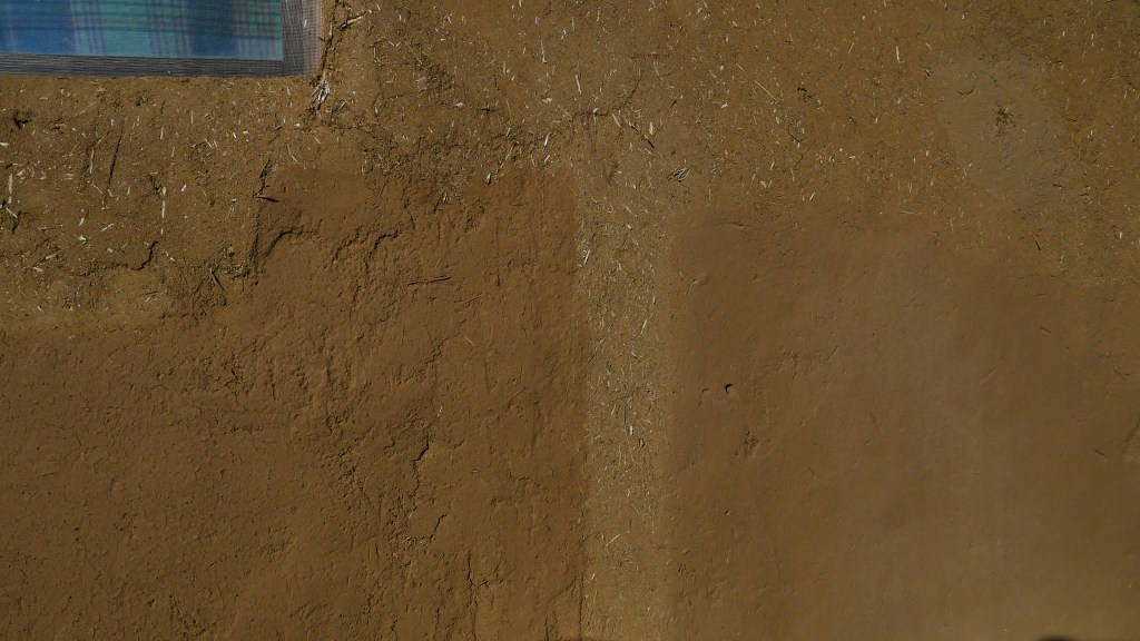 We took out all the carpets, table, couch, we filled in the holes with cob – a mix of clay, sand and straw, and we put the plaster. Plaster is made with filtered clay, filtered sand, filtered straw (1.2 of clay – 3 of sand -1 of straw). We started by the ceiling, and we continued with the walls. Now we have a beautiful living room, and we’re waiting for it to get completely dry, to fill it back in!