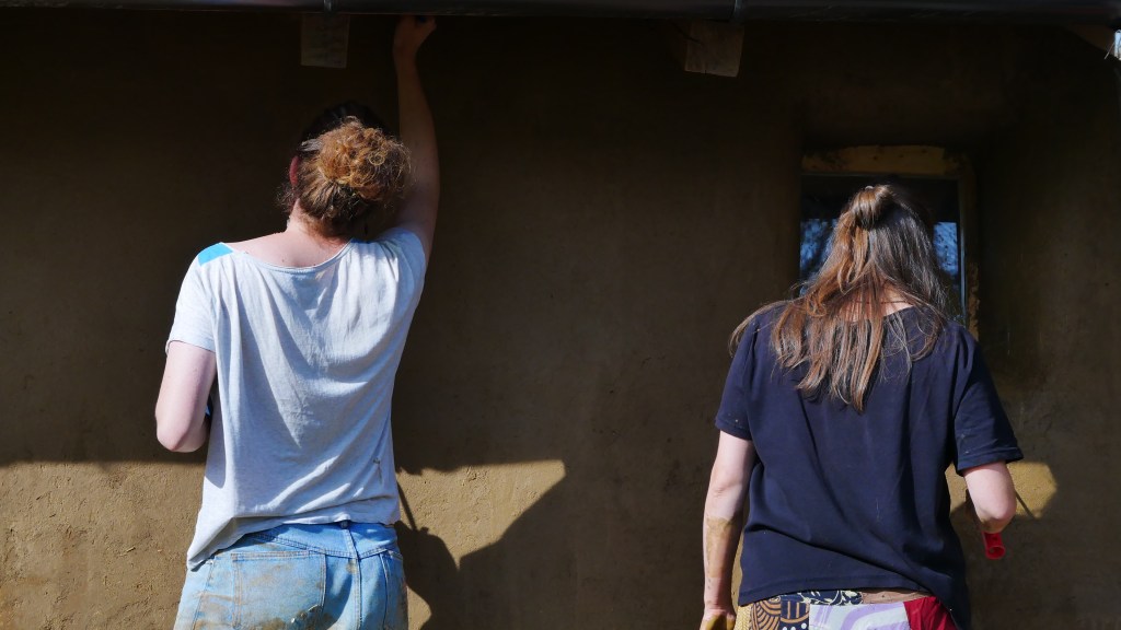 The special task of this autumn is PLASTERING. There is the « Red House » that has to be finished for winter. With the most energetic team of volunteers, we managed to plaster the outside of the house and the first layer inside ! The first layer inside is a plaster made of 1 measurement of clay, 1.5 sand and lots of straw , called COB.